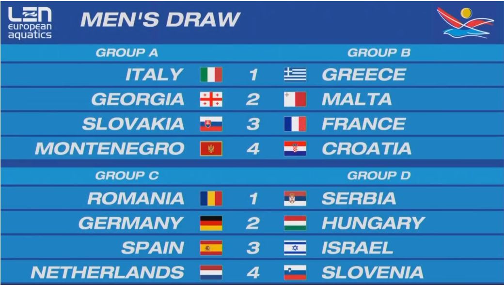 Vaterpolisti Crne Gore na Evropskom prvenstvu u Splitu igraće u grupi A sa selekcijama Italije, Gruzije i Slovačke. Prvoplasirane ekipe igraće četvrtfinale, dok će drugoplasirane i trećeplasirane selekcije igrati osminu finala.